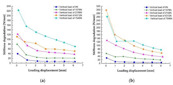 Stiffness degradation of specimen: (a) Frontal direction and (b) Lateral direction.