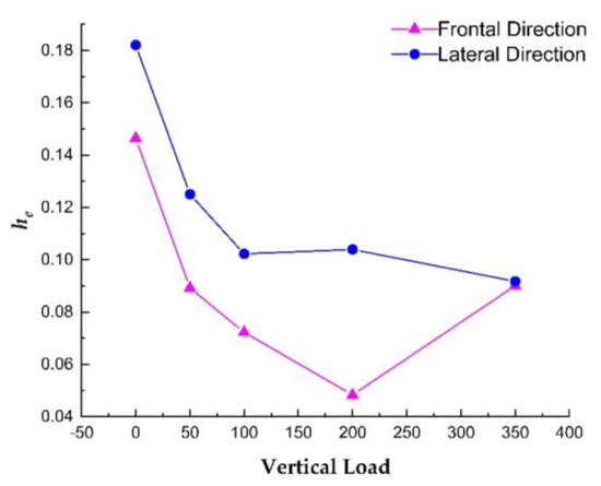where he is the energy dissipation factor, Ea is the total dissipated energy of the first cycle at a different vertical load, and Ep is the potential energy at maximum deformation in the positive direction in the first cycle under displacement control. Figure 12 shows the energy dissipation as a function of vertical load. For the same vertical load, the energy dissipation factor is greater in the lateral than in the frontal direction. The initial energy dissipation varies for different vertical loads. It also reflects the relationship between roof load and energy dissipation.