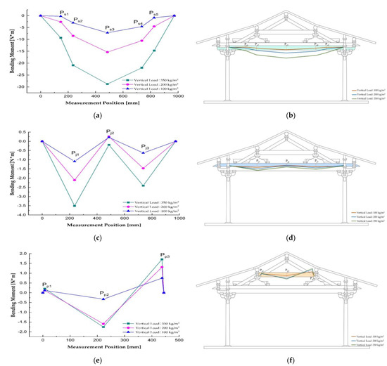 The axial force is the force resisting deformation that extends or retracts in the axial direction of a component. When a vertical load of 350 kg/m2 is applied to the specimen, the first building component to be transferred is Cha Shou, which is compressed and generates axial force. As shown in Figure 15a,b, the axial force is 251 N, which is twice that of the roof load at 200 kg/m2. Tang Dynasty building structures use the triangular Cha Shou to support the transfer of vertical loads, and as the vertical loads increase, so does the axial force at Cha Shou. Therefore, as an important load-bearing element, it should be structurally strengthened in future restoration projects.