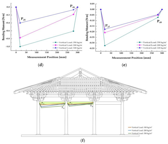 Lan’E, as a transverse component connecting the columns, produces very little bending deformation Figure 14a,b,d,e when the building is applied to a vertical load. The results show that the vertical load does not bend the appendage, and it does not act as a load-bearing element. However, as Figure 14b,d show, the bending moment of Pr4, Pr5 is greater than that of Pr3, Pr6, and the corner columns are subjected to greater vertical loads than the other columns.