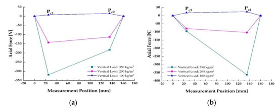 With roof loads of 100 kg/m2 and 200 kg/m2, the axial forces of the left and right Cha Shou are depicted in Figure 15a,b, respectively. The number of iron blocks used is sufficient to guarantee a balance between the left and right quantities when they are placed. The axial forces of the left and right Cha Shou are different under a vertical load of 350 kg/m2. This is due to an imbalance in the 770 iron blocks’ manual placement, which causes the axial forces of the left and right Cha Shou to differ.
