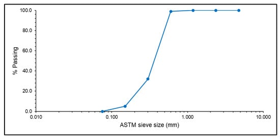 Local sand conforming to ASTM C33 [] was used in this work. The sand was first sieved through ASTM No. 30 sieve and then washed over ASTM No. 200 sieve to achieve particle size between 75–600 µm. After washing, the sand was kept in an oven at 105 °C to achieve 0% moisture content. Specific gravity and absorption values of the sand were determined according to ASTM C128 [] and were found to be 2.78 and 2.35%, respectively. The particle size distribution of fine sand is shown in Figure 1, which is determined as per ASTM C136 [].