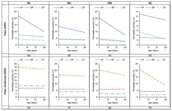 Permeable porosity of plain UHPC mixtures cured under (a) SC, (b) MC, (c) WB, and (d) HC regimens and permeable porosity of fiber reinforced mixtures cured under (e) SC, (f) MC, (g) WB, and (h) HC regimens.