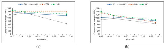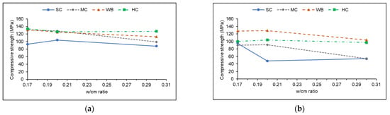 However, a different trend was observed for the fiber reinforced UHPC mixtures under the MC curing regimen. On average, fiber reinforced mixtures exhibited 4% less compressive strength than plain mixtures. The reason for the lower compressive strengths of fiber reinforced mixtures can be attributed to the greater permeable porosity observed under the MC curing regimen (Figure 4b,f). The MC cured fiber reinforced mixtures had 42% more permeable porosity than plain mixtures.