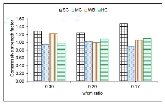 Permeable porosity values for all UHPC mixtures are presented in Table 4 and Figure 4. UHPC mixtures exhibited very low porosity values. These values ranged from 1.7 to 21.8% after seven days of curing, while this range was between 1.7 and 16.7% after 28 days of curing. Here, porosity increased with the w/cm ratio. These values are consistent with the literature [,]. It has been observed that the curing period, curing temperature, fiber dosage, and silica fume content affect permeable porosity.