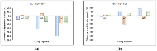 Difference in split tensile strength compared to SC curing regimen for (a) plain mixtures and (b) fiber−reinforced mixtures.