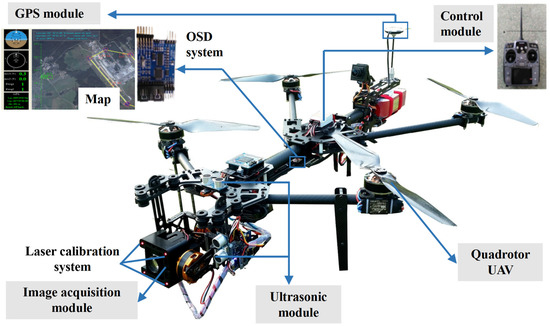 This study used a self-designed quadrotor UAV for crack detection, as shown in Figure 2. The quadrotor UAV consisted of four modules, namely, the control module, the image acquisition module, the global positioning system (GPS) module, and the ultrasonic module. Regarding the control module, an Ardu Pilot Mega (APM) flight controller was employed, produced by the DJI Innovation Company, which was used to automatically maintain the typical flight attitude of the aircraft. Meanwhile, the remote controller was used to handle the driving operation of the brushless motor in the quadrotor UAV. Moreover, two batteries with a capacity of 3500 mAh were equipped in the UAV, and a set of fully charged batteries can support up to 35 min of flight time
