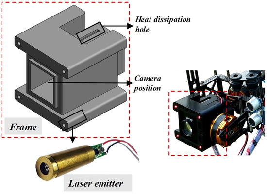 In this work, a novel image acquisition system based on a UAV was proposed for perspective angle correction, and its diagram is shown in Figure 5. The lens and four-point laser emitter were mounted and fixed on the frame of the image acquisition system. Four parallel lasers were emitted and distributed at each square vertex when the UAV found cracks. Images with cracks and laser points were obtained by a high-definition camera and processed by a geometric correction and calibration algorithm. To assure the emitted immunity, stability, and suitability of the laser for operation in bright sunlight and severe conditions, 50 MW industrial laser emitters were also utilized. Therefore, before image-to-object resolution analysis, the obtained image was corrected so that the distribution shape of the laser points was square. In this way, the acquired image could be calibrated by the four laser points, so that the ratio of actual cracks to image cracks could be accurately converted.
