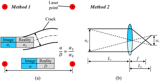 Furthermore, the crack width calculation methods based on the lens imaging concept were compared with Method 1 in this study, as denoted by Method 2. Method 2 estimated the distance between the UAV and the measured target (L1) using the ultrasonic module synced with the camera shutter. The relationship between L1 and the image distance (L2) is shown in Equation (13), according to the lens imaging concept: