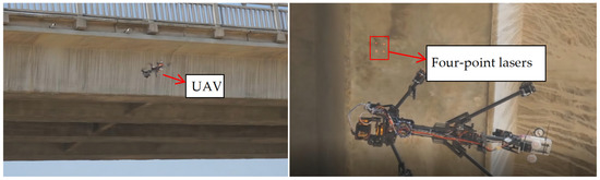 The field tests on crack assessment were conducted on Beiwang Bridge (Figure 10). Since the ultrasonic module can determine the shooting distance between the UAV and the detected surface, the proposed method based on four-point lasers was compared to the lens imaging methods, as presented in Section 5.3. The results show that the proposed methods can accurately identify crack width, and the global average value of the crack width ratio of Method 1 to width measurement was 0.97 (Table 1). Moreover, the four-point laser method showed greater precision for crack width identification than the method based on lens imaging because Method 1 carries out the scale conversion directly on the crack image (Figure 13).