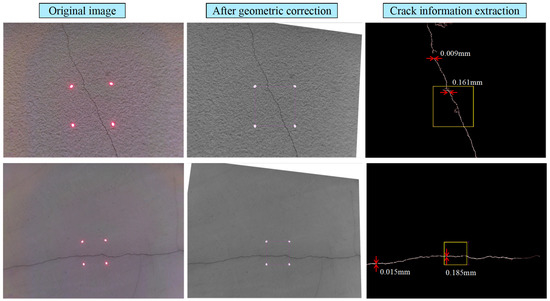 In this work, a LoG edge detector was adopted to extract the margins of the cracks to determine the crack width information. LoG detectors had the most remarkable crack detection rate compared to several regularly used edge detectors [40]. Compared with machine learning, the proposed method does not suffer from overfitting due to sparse training samples in practical applications. After identifying the crack’s edge, the author calculates its actual width by dividing the pixel distance between adjacent laser points by the actual distance (Figure 9). Moreover, the authors compile a series of image correction and processing procedures into software, making the UAV-based crack identification system more widely used (Figure 11).
