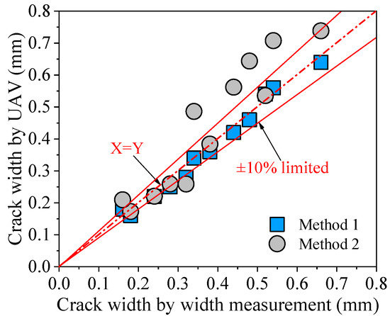 Twelve cracks were selected in the easily accessible areas, and the maximum crack width values were measured using high-precision width measurements. The results of the manual measurements were compared with those obtained by the UAV crack identification system, as shown in Figure 12 and Table 1. For Method 1, it was possible to observe nearly all of the data that were close to equal (X = Y) and fell below the 10% restriction. For Method 2, some discrepancies were observed between the manual and UAV crack measurement results. Moreover, the global average value of the crack width ratio of Method 1 to width measurement was 0.97, with a standard deviation of 0.07 and a coefficient of variation of 7.59%. In comparison, the global average value of the crack width ratio of Method 2 to width measurement was 1.15, with a standard deviation of 0.18 and a coefficient of variation of 15.73%. The results indicated that both the methods for the UAV crack identification system could successfully calculate the actual crack width. Four-point laser-based Method 1 identified the crack width with greater precision and showed considerable promise for use in actual engineering applications.