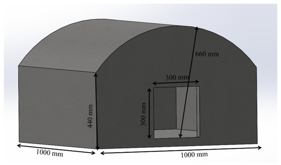 In the scaled test, the scaled model of an earth-covered magazine was used to estimate the internal explosion effect. The scaled model with the reinforced concrete structure is illustrated in Figure 1. The concrete mixture ratio was mcement:mwater:msand:mstone = 1:0.56:1.3:1.7, and the diameters of steel bars were 6 mm, 8 mm, and 10 mm, respectively, and the spacing of the reinforcement bars was 100 mm, the wall thickness was 50 mm, and a square hole with the size of 300 mm × 300 mm is set in the front wall. After 28 days of curing, the compressive strength of concrete was 34.2 MPa using a servo-hydraulic universal testing machine.