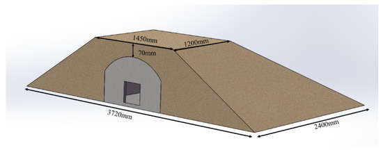 According to the requirements in the standard [24], the scaled model of the covering soil is shown in Figure 2. The soil thickness was 70 mm, and the slope was 1:1.5.