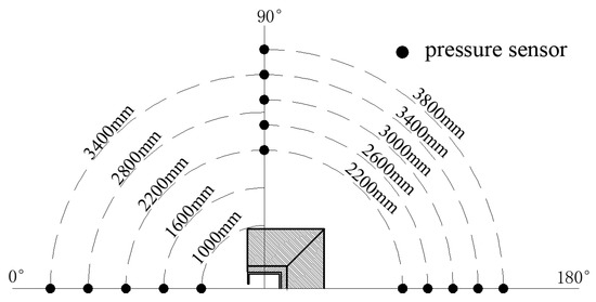 Figure 3 shows the detailed sensor layout diagram: the PCB137 pressure sensors and Swiss KISTLER pressure sensors were applied in the experiment. The range of the sensor with the resonance frequency of 500 kHz was 3.45 MPa, and the signals from the pressure sensors were measured by the data acquisition instrument (DongHua 9522N, Donghua Testing Technology Co., Ltd., Taizhou, China) at a sampling rate of 1 MHz. Five sensors were arranged in the direction of 0°, 90°, and 180°, respectively. The sensor bracket was fixed with the ground through the expansion bolt to avoid the brackets shaking during the test. The sensor installation is shown in Figure 4. To reduce the effect of light and heat on the pressure sensors, these sensors are coated with aluminum film and silicone grease.