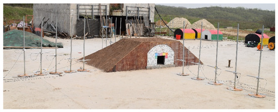 Figure 8 shows the photographs of the model before and after the explosion obtained by the UAV. It can be found that the outer space of the earth-covered magazine is divided into four regions according to the dispersion of soil, namely the front (−60° to 60°), the rear (135° to 225°), and the sides (60° to 135°, 225° to 300°), which are consistent with the division of the outer region of the earth-covered magazine given in the specification. Figure 9 depicts the model after the destruction of the earth-covered magazine: the debris projection distance in the directions of the two sidewalls and the rear wall is small, mostly falling within the range of 5 m around the model, and the projection distance of the soil in the directions of the two sidewalls is not more than 5 m. However, due to the damage to the roof under the shock wave (Figure 9), the soil above flies backward, and the furthest projection distance of the soil in the 180° direction is more than 10 m. The debris projection distance of the front wall is much larger than that of the other walls due to the absence of the constraining effect of the soil thereon. As shown in Figure 10, the debris projection distance in the direction of the front wall reaches 82 m, and the debris is distributed in the range of ±60° in the direction of the front wall. The further fragments (40 m or more) were confined to a limited sector within the front range of ±30°.