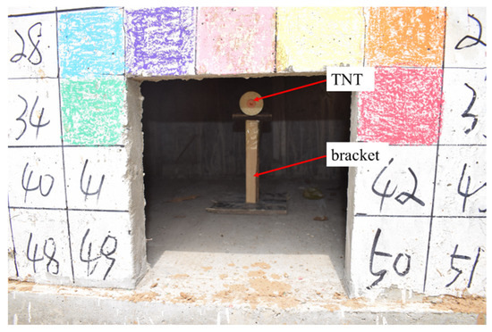 The cylindrical TNT charge was selected as the explosive, the density was set to 1.63 g/cm3, and the total equivalent TNT mass was 0.5 kg. To enable TNT to be detonated quickly, the electric detonator was used to detonate the RDX explosive column and then detonate the TNT explosive. The explosive was fixed at the center of the model by a wooden bracket, and the axial direction of the explosive was perpendicular to the front wall. The TNT and the bracket are displayed in Figure 6.