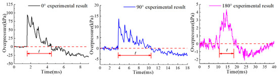 Figure 7 shows the typical pressure–time histories in the 0°, 90°, and 180° directions: there are multiple peaks in the pressure–time histories, which is due to the multiple reflections of the explosion shock wave within the structure. Each reflection can increase the shock wave pressure and form a new peak. Table 2 lists the overpressure peak and duration obtained by pressure sensors in three directions. The overpressure peak gradually decreases with the increase in scaled distance, and the overpressure in the 0° direction is significantly greater than that in the 90° and 180° directions. The peak overpressure in the 180° direction is the smallest. This finding indicates that the external overpressure caused by the internal explosion of an earth-covered magazine presents clear directionality. This is because there is a hole in the front wall (0° direction). Before the structural failure, the shock wave can only be released from the hole, which makes the shock wave converge at the front hole and increases the peak overpressure in the 0° direction. The shock waves in the 90° and 180° directions are composed of two parts, some waves diffracted from the front wall, and others were released from other walls after the structural failure. Due to the rapid attenuation of the shock wave, and the energy dissipation on the structure wall, the overpressure in the 90° and 180° directions is small. However, the duration of positive pressure is the longest and the shortest in 180° direction and 0° direction, respectively. This is due to the superposition of multiple shock waves in the 180° direction, leading to a long duration of overpressure.