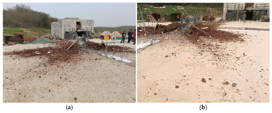 A UAV was used to ascertain the overall damage before and after the test. The different surfaces were painted in different colors to distinguish the projection direction and location of the fragments after the explosion (Figure 5). After the test, the structural fragments were collected, and some debris distributions were obtained.