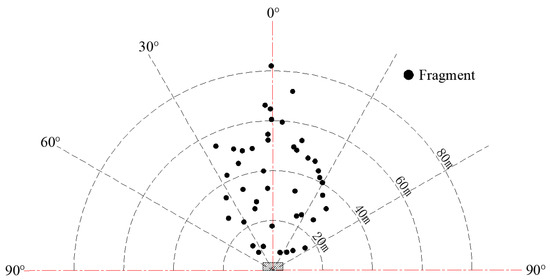 - The earth-covered magazine was severely damaged by the internal explosion. The outer space of the earth-covered magazine is divided into four regions according to the dispersion of soil, namely the front (−60° to 60°), the rear (135° to 225°), and the sides (60° to 135°, 225° to 300°). The maximum projection distance of the debris in the front wall reaches 82 m, and the debris is distributed within the range of ±60°. The further fragments (40 m or more) were confined to a limited sector within the range of ±30°.