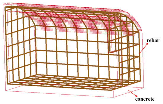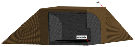 The model is a symmetric structure, and a half-model was established for the convenience of calculation. The models of air, explosives, concrete structure, steel bar, and soil were built in the software. For air, explosives, and concrete, eight-node solid elements were used, for steel bars, a two-node beam element was used. The element adopted the ALE multi-material algorithm, in which the air and explosives adopted the ALE mesh, the concrete element used the Lagrangian mesh, and the structure and air and explosives were subject to a penalty coupling function in the fluid–structure interaction algorithm. The fluid–structure interaction algorithm was also used between concrete and steel bars (Figure 12). To replicate the throwing of soil, the soil was calculated in the form of the smoothed particle hydrodynamics (SPH). Except for the symmetry plane and the ground, non-reflection boundaries are set at other air boundaries, the earth-covered magazine model is only limited to the vertical displacement of the bottom surface, the symmetry boundary was set at the symmetry plane, and automatic_node_to_surface is set between the soil and the structure. The keyword LOAD_BODY_Z was adopted to simulate the influence of gravity.