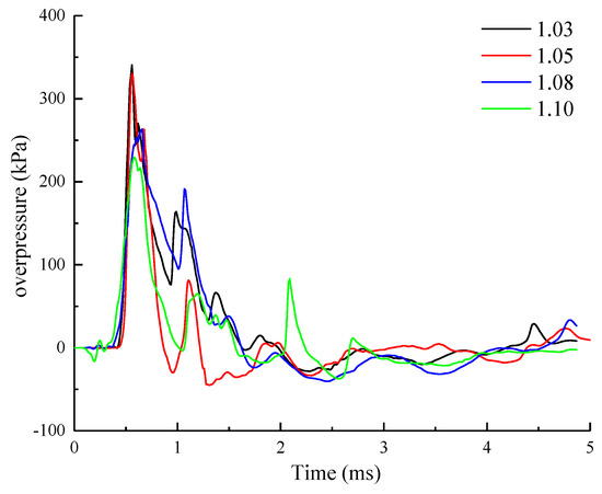 The air was meshed with a gradient mesh to reduce the number of elements, thereby decreasing the calculation time. To study the influence of mesh refinement on the results, four mesh densities of 1.1, 1.08, 1.05, and 1.03 were used for mesh convergence analysis. The pressure curve at the same position is displayed in Figure 15. The basic information about each of the pressure–time histories is summarized in Table 4.