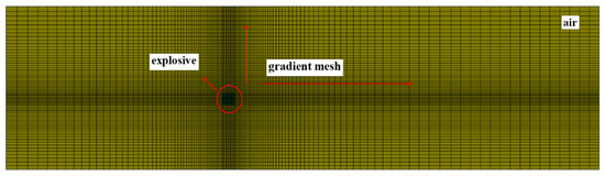 The results show that as the mesh refinement decreases (from 1.05 to 1.10), the overpressure peak increases gradually. When the rate of change thereof is adjusted from 1.05 to 1.03, the pressure peak does not increase significantly, while the number of elements increases from 401,940 to 805,752. In contrast, it is more appropriate to use a mesh gradient of 1.05. The model is shown in Figure 16.