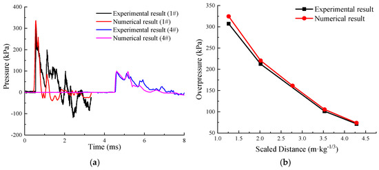 Comparison of experiment and numerical simulation. (a) Comparison of overpressure time-history curves of 1# and 4# gauge; (b) comparison of overpressure peak in the 0° direction.