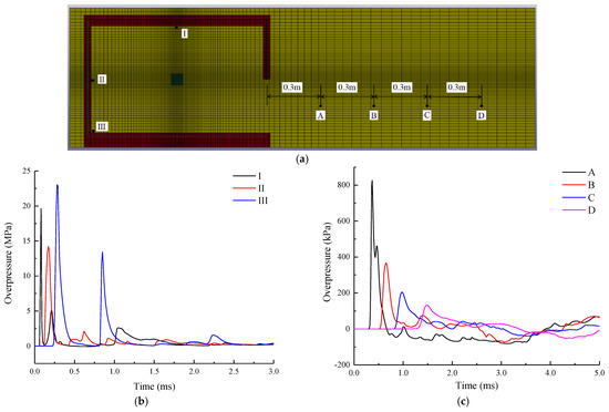Figure 18 shows the pressure time histories at different positions obtained from the simulation, in which Figure 18a depicts the measuring point positions, and Figure 18b displays the pressure time histories at different positions inside the structure. The three positions are the blasting center at the projection of the roof, the blasting center at the projection of the rear wall, and the intersection of the rear wall and the ground. It can be seen from the figure that the peak overpressure at the corner point is higher than the pressure elsewhere, which matches the results of Edri 2. Since the waves converge at the internal edge line and corner point of the structure, the pressure at these positions increases. Figure 18c illustrates the pressure time histories at different locations in the external space. The peak overpressure value is decreasing with the increase in scaled distance, while the duration of positive pressure increases with the increase in scaled distance.