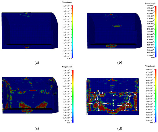 Structural crack development. (a) 0.13 ms; (b) 0.16 ms; (c) 0.48 ms; (d) 1.2 ms.