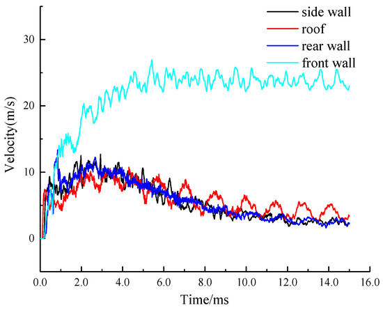 Figure 22 presents the summary of the velocity of concrete elements in each region by numerical simulations. The time sequence of velocity mutation is the same as that of the shock wave arrival. The first impact is on the roof, followed by that on the walls. The front wall has a relatively large launch velocity, which can reach 25 m/s due to the absence of any constraining effect from the soil. The velocities of the roof, sidewall, and rear wall increase continuously under the action of the blast shock wave, however, due to the influence of the soil, there is a maximum velocity observed thereat, around 10 m/s. After passing the value, the velocity gradually decreases, and the launch velocity of the fragment is only 4 m/s.