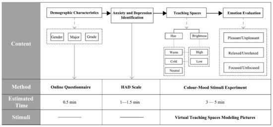 In this study, a questionnaire was distributed and filled out through the “Questionnaire Star” platform to collect the subjects’ emotional evaluation of the teaching space with different colour characteristics. The research idea is shown in Figure 1.