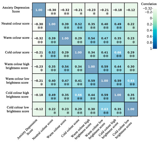 According to the results of the correlation analysis presented in Figure 4, it can be observed that there are significant correlations among all variables. The correlation coefficients of the scores of all variables were more than 0, except for the negative correlation coefficient of the depression score. So, the anxiety-depression score was negatively correlated with the rest of the hue and lightness scores and positively correlated with the scores of all the remaining variables. For example, the correlation coefficient between the anxiety-depression score and the warm colour score is −0.318 **, which means that they are significantly correlated at the 99% significance level and are negatively correlated. By analogy, this can explain the correlation between all other variables. The higher the anxiety-depression value, the lower is the colour score. The higher the hue score, the higher is the lightness score.
