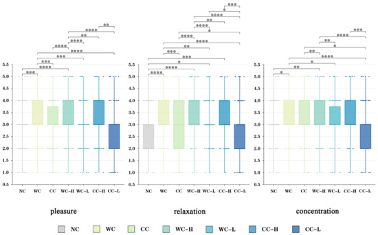 As can be observed from Table 3, for the three emotional criteria of pleasure, relaxation, and attention, the subjects’ scores all showed with the mean values: warm classroom (WC) > cold classroom (CC) > neutral classroom (NC). This indicated that the healing effect of warm colours is greater than that of cold colours, and the healing effect of cold colours is greater than that of neutral colours. Combined with Table 4, it can be seen that the mean values of subjects’ scores showed a trend of warm colour high brightness (WC-H) > cold colour high brightness (CC-H) > warm colour low brightness (WC-L) > cold colour low brightness (CC-L), indicating that the healing effect of high brightness is greater than that of low brightness based on colour hue.