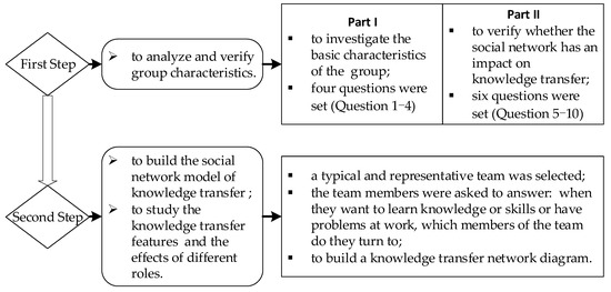Considering that a significant number of construction workers in China are poorly educated and some are even illiterate [14], a two-step investigation based on a questionnaire survey was developed to achieve the three objectives of this paper, which were set out in Section 1. The first step of the investigation was to analyze and verify the regional concentration, group closure and frequent mobility of construction workers. The second step of the investigation was to build a social network model of worker knowledge transfer according to group characteristics and study the knowledge transfer features of the workers and the effects of different roles within the network. A flow chart of the research [37] is shown in Figure 1. The questionnaire was designed according to the following two basic principles: