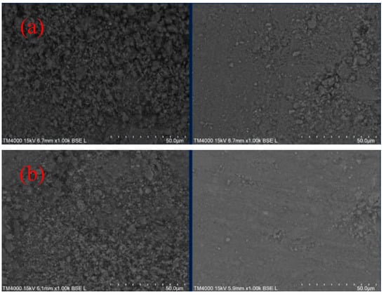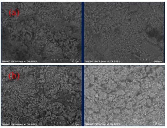 SEM images of drilling samples impacted by piling (magnification 2000 times): (a) Pile end; (b) 0.5 m below pile end.