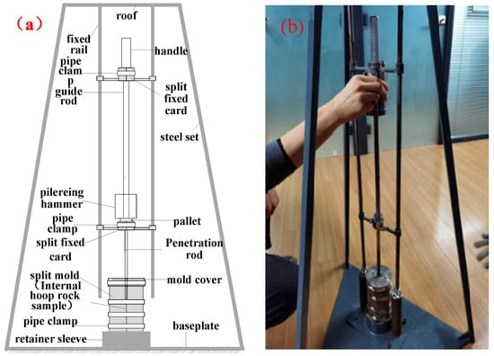 Figure 3 shows that the area of the probe rod in the guide rod type simulated dynamic pile driving, and the test device is 1 cm2 (11.3 mm in diameter). The length of 200 mm is utilized to simulate the pile. A 2.5 kg core-piercing hammer drop distance of 30 cm is employed to provide simulated piling hammering force. The mudstone samples were collected from the moderately weathered mudstone at the test site. The diameter of the test sample is consistent with that of the open mold, which measures 90 mm in diameter and 200 mm in height. Packaging rock samples with an open mold (double-pipe) is conducive to opening the sample for cutting observation and testing after simulated piling.