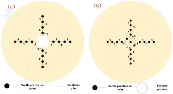 Schematic diagram of penetration point (unit: mm): (a) Section within pile body; (b) Section surface at pile end.