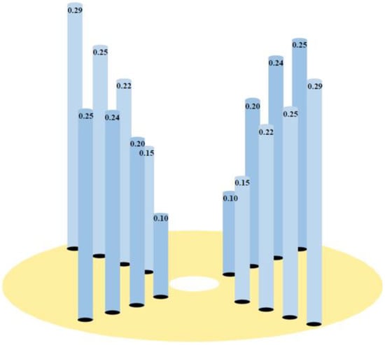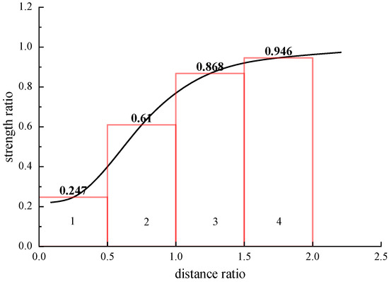 According to Figure 7b, the relationship that governs the distance between the pile side and the pile side (represented by the distance ratio s/d) and the strength (represented by the strength ratio Rc’/Rc) is shown in Figure 9. It can be seen that the range of 2.0d from the pile edge is divided into four regions. The midpoint curve ordinate of each interval is shown in the figure, and this value is approximated as the average of the region’s strength ratio. This is called the reduction coefficient of average compressive strength.
