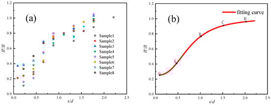 Based on Figure 7a, the nonlinear fitting of various curve forms is carried out. The optimum fitting curve of the R′/R-s/d relationship is shown in Figure 7b, and its numerical model is as follows: