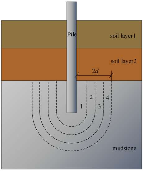 The above tests show that the soil around the pile forms a specific disturbance-damaged area during pile driving. With the increase in time upon pile driving, the strength and modulus of the Quaternary soil in this region gradually recover under the thixotropic recovery effect. However, the recovery of mudstone upon damage in the disturbed area is limited. When the rock and soil parameters are assigned, the bearing capacity of the pile is overestimated if the mudstone parameters in the disturbed area are the same as those in the undisturbed area. Therefore, when the numerical model of the static load test is established, the mudstone around the pile is assigned to different regions. Accordingly, it is assumed that the influence range of mudstone on the pile side is 2.0d, and the influence range below the pile end is approximately arc-shaped. The strength of mudstone gradually increases from inside to outside. When the distance is 2.0d, the strength of the mudstone transits to that of the undisturbed mudstone. The specific method is to divide the disturbance area into four parts on average, from inside to outside and from 1 to 4 parts, and the width of each part is 0.5d. The parameter setting of each part is realized, and the schematic diagram of the model establishment is shown in Figure 8.