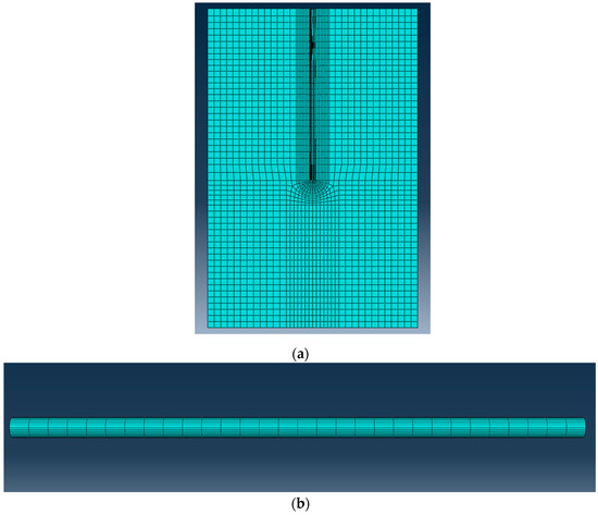 Schematic diagram of the ABAQUS model. (a) Soil grid division; (b) Grid division of PHC pipe pile.