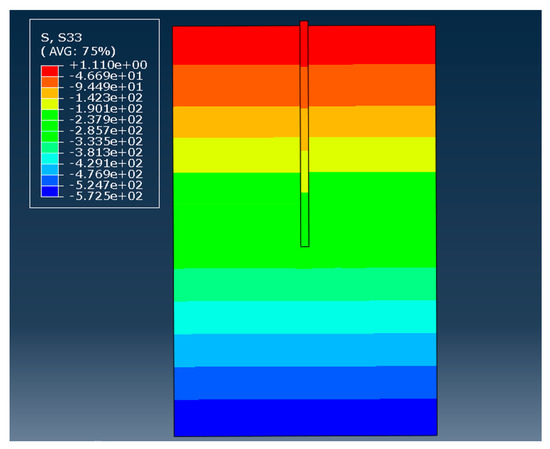 Firstly, the stress balance is carried out, followed by submitting the initial and step-geo to the task in ABAQUS, and the results of the in situ stress balance of soil are obtained. Figure 11 and Figure 12 reveal the vertical stress and displacement after in situ stress balance.