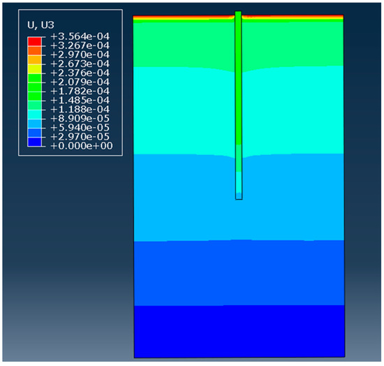 Figure 11 indicates that the initial vertical stress of soil is uniformly distributed at the same depth and increases gradually from top to bottom, with the change of numerical value also representing the variation of the soil layer from top to bottom. In addition, Figure 12 demonstrates that, after the in situ stress is balanced, the vertical displacement of soil is small, with a magnitude of −4–−5. The vertical displacement of soil under gravity stress can be considered to be close to zero. In summary, the in situ stress equilibrium results of soil are correct, and the initial stress conditions of soil are consistent with the load, boundary conditions, and soil state. In the current model, the original stress state of soil is considered.