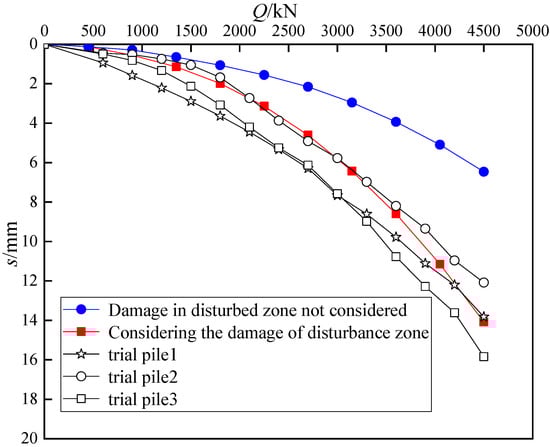 Figure 13 compares the load-settlement curve of the field test with ABAQUS simulation results. It indicates that the static load curve of numerical simulation without considering the influence of disturbance damage area differs significantly from the measured curve, and the pile’s top load corresponding to the same settlement is considerably higher than the field measured value. The static load test curve of numerical simulation considering the influence of disturbance damage zone agrees well with the measured curve. The load-settlement curves exhibit slow variation and have no obvious inflection point. When the pile’s top load increases to 4500 kN, the final settlement of the pile foundation is 14.08 mm, which is the settlement considering the influence of damage in the disturbance area, and it is close to the final settlement of the field static load test. The settlement of the pile foundation is only 6.99 mm without considering the damaging effect of the disturbance zone, which is quite different from the field test results presented in this paper.