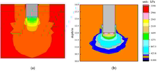 Vertical stress nephogram of mudstone at the pile tip. (a) Vertical stress cloud diagram of pile end mudstone; (b) The optimized vertical stress cloud diagram of pile end mudstone.