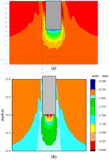 Vertical displacement nephogram of mudstone at the pile tip. (a) Vertical displacement cloud diagram of mudstone at pile end; (b) Optimized vertical displacement cloud diagram of mudstone at pile end.
