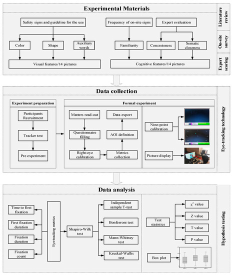 As shown in Figure 1, the research process was divided into three parts including material selection, data collection and analysis. This study firstly selected 28 pictures according to the visual and cognitive features of construction safety signs. Secondly, 41 participants’ eye movement data was collected by eye-tracking technology. Finally, statistical analysis methods were used to test research hypotheses and explore the influencing mechanism of safety sign features on construction workers’ visual attention.