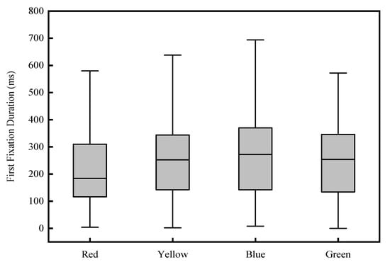 Box plot of construction safety signs’ first fixation duration in different colors.