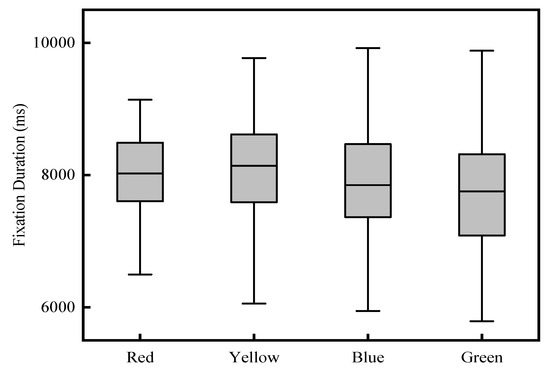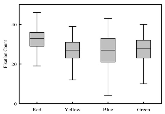 Further studies showed that FFD in red signs and blue signs was significantly different (p = 0.023 < 0.05). Figure 3 was a box plot of FFD in different colors, the median of FFD in red signs was 184 ms and the median in blue signs was 272 ms. The FFD of red signs was significantly lower than blue signs. It indicated that red signs could reduce the visual load of first fixation. FD was significantly different between yellow and green signs (p = 0.017 < 0.05). Figure 4 was a box plot of FD in different colors, the median of FD in yellow signs was 8142 ms and the median in green signs was 7752 ms, which indicated that green signs could significantly reduce overall cognitive load. FC in red was significantly different from yellow, blue and green (p = 0.000< 0.05). In Figure 5, the box plot showed that the median of FC in red signs was 33.00 while the median in green signs was 28.00, which indicated that green signs can significantly reduce visual load and it was consistent with test results of FD.